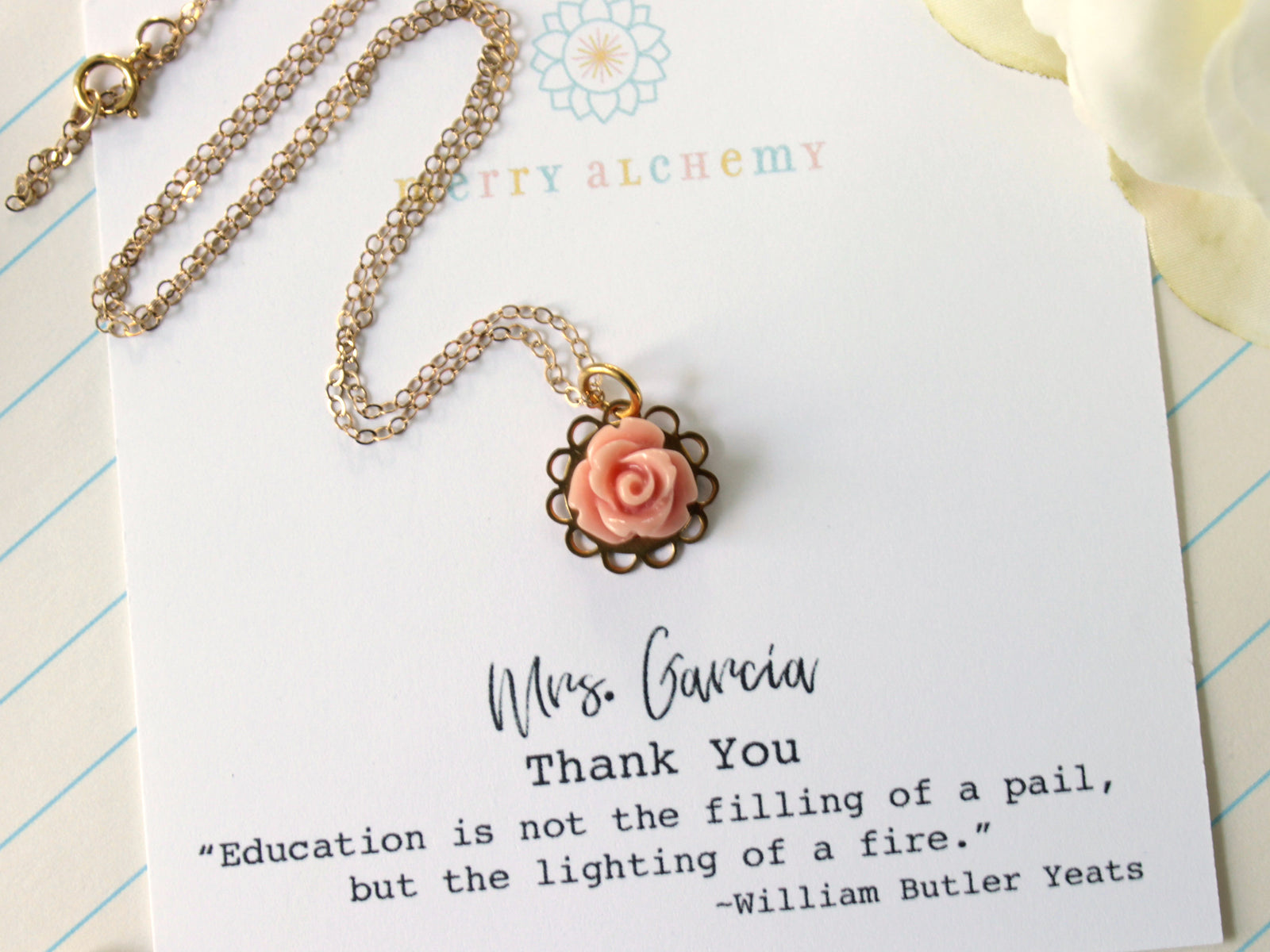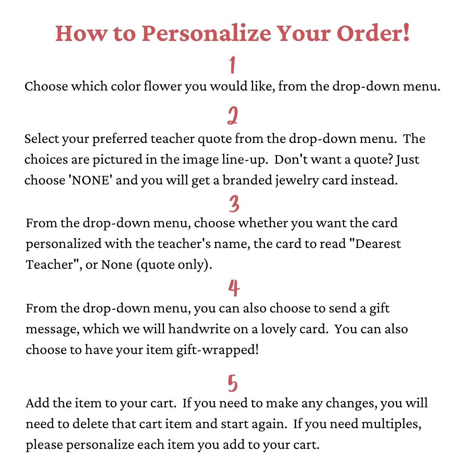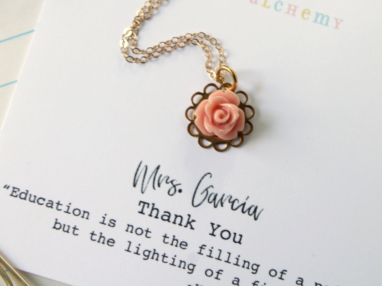 Show your appreciation for your kids' teachers with a unique floral necklace that hangs delicately from a personalized card with a beautiful sentiment that shares your gratitude for her.You get...
