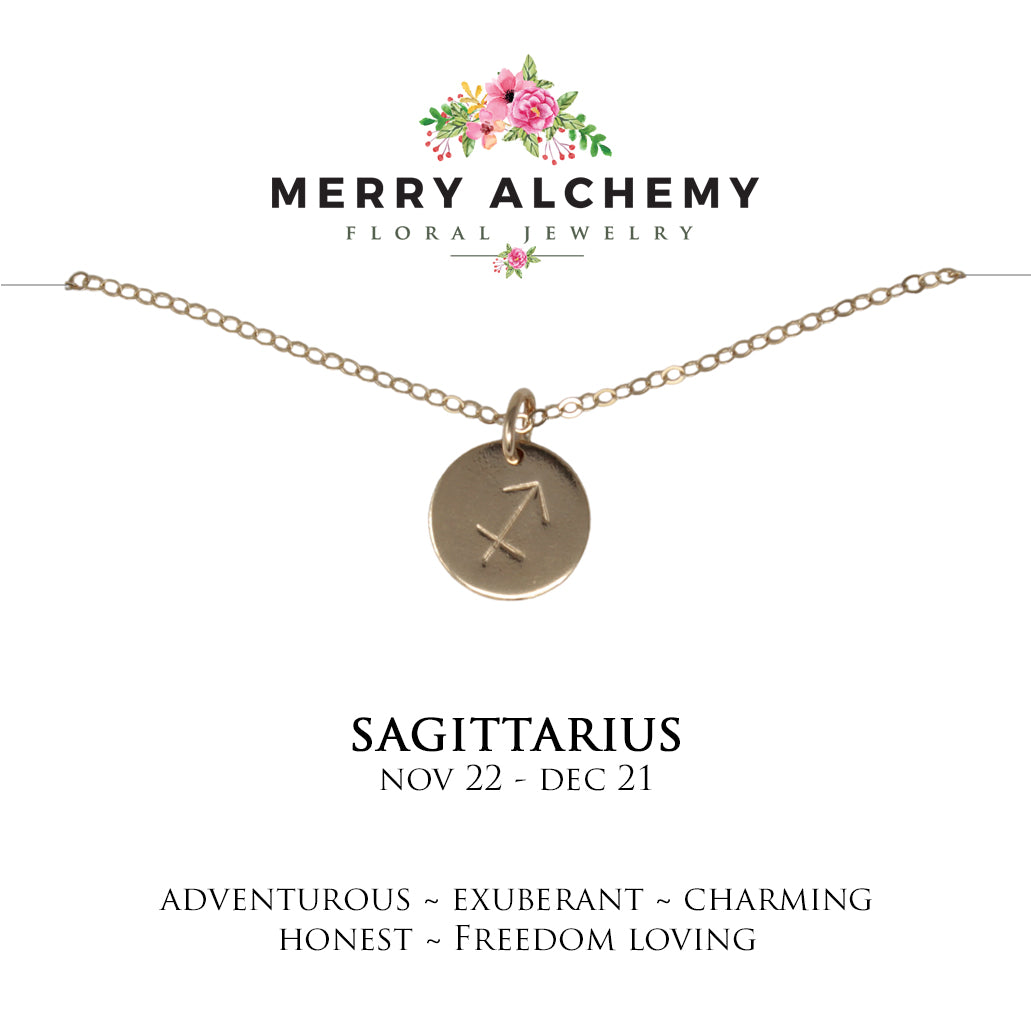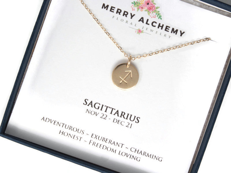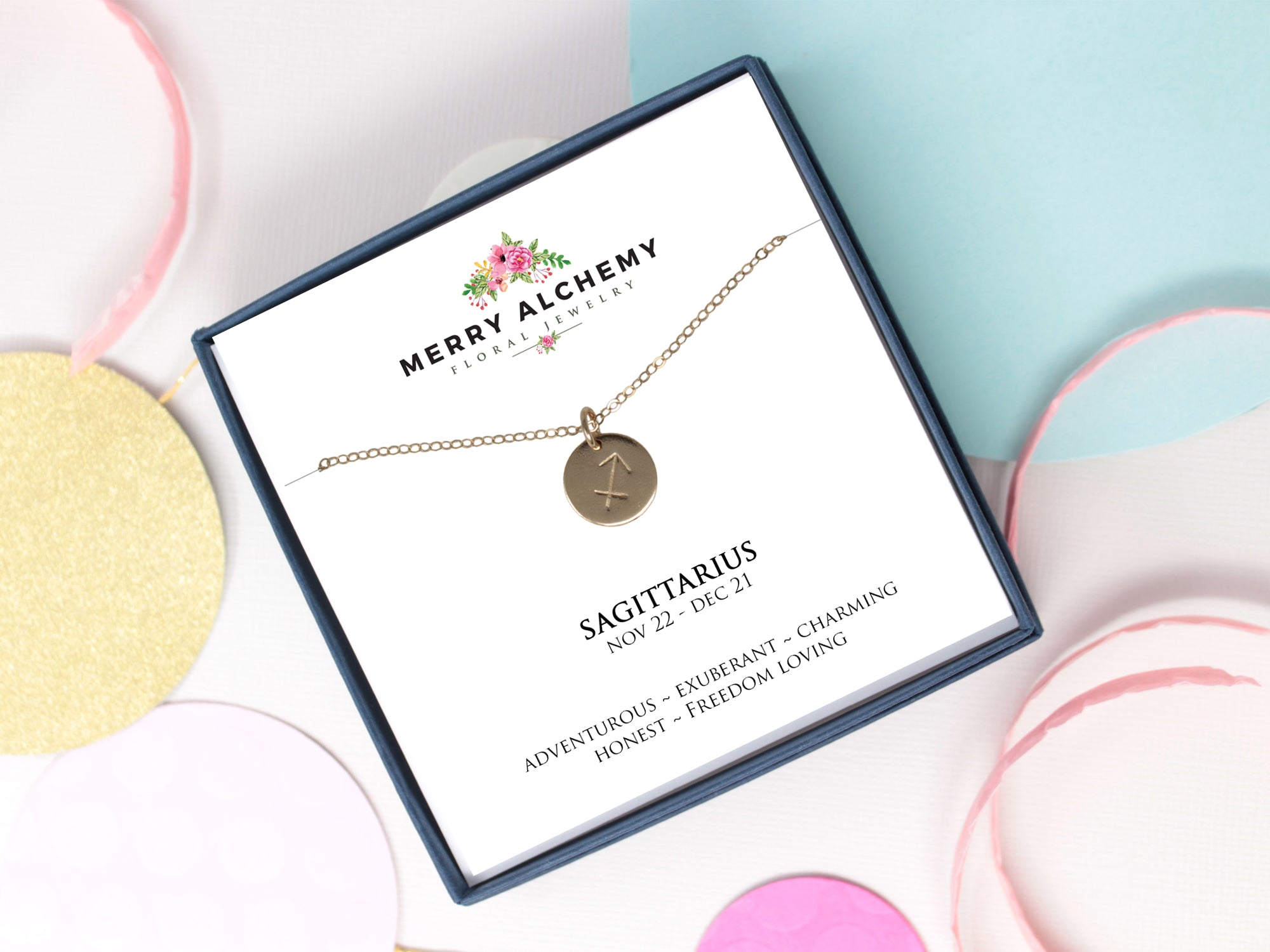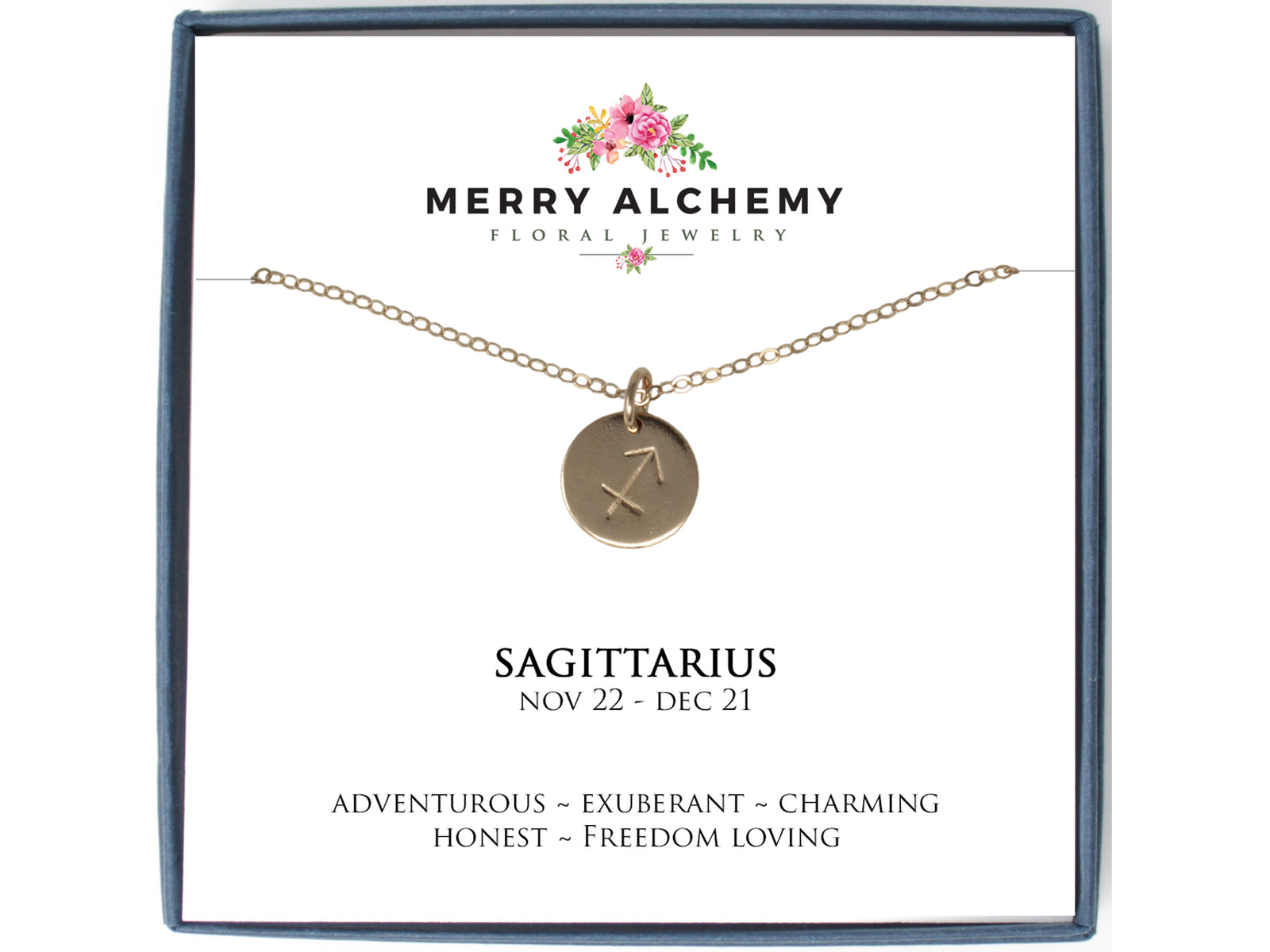 Celebrate your Sagittarius girl with a classic, handmade zodiac necklace!This lovely gold filled necklace is attached to a card with the unique traits of the Sagittarius girl. So you are gifting something...