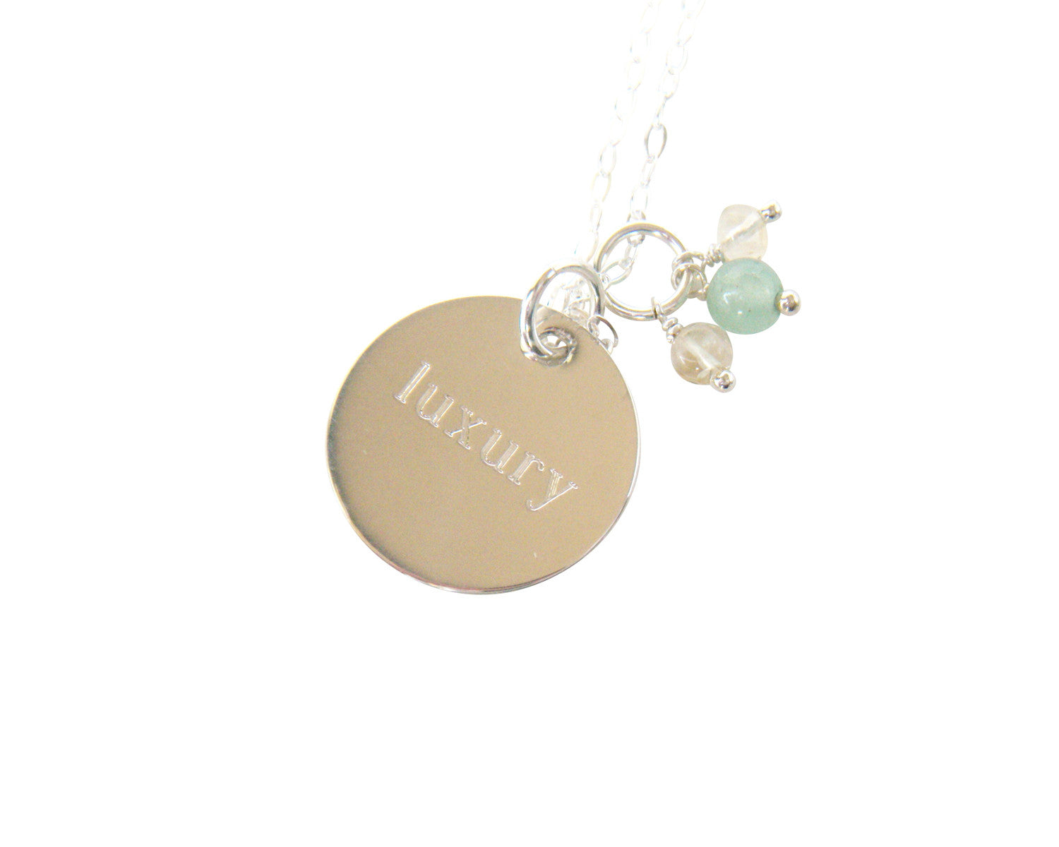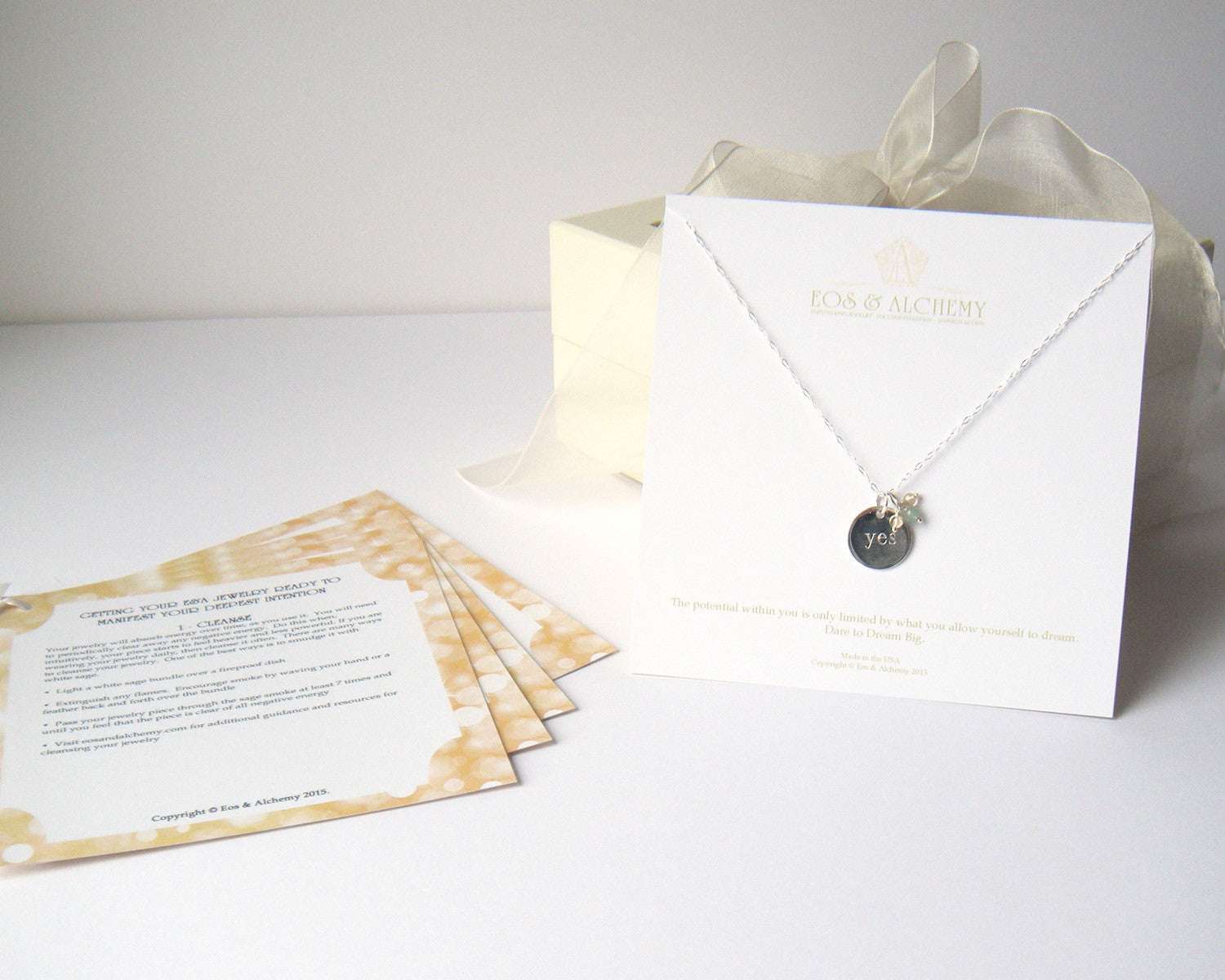 A sterling silver disc dangles from the sterling silver chain with the word 'yes' engraved on one side and your secret intention engraved just for you on the opposite side. Why 'yes'? Because by saying 'yes', you are telling The Universe that you are open and ready to make things happen. You can choose from a variety of intentions or choose a custom intention up to 8 letters/digits.
