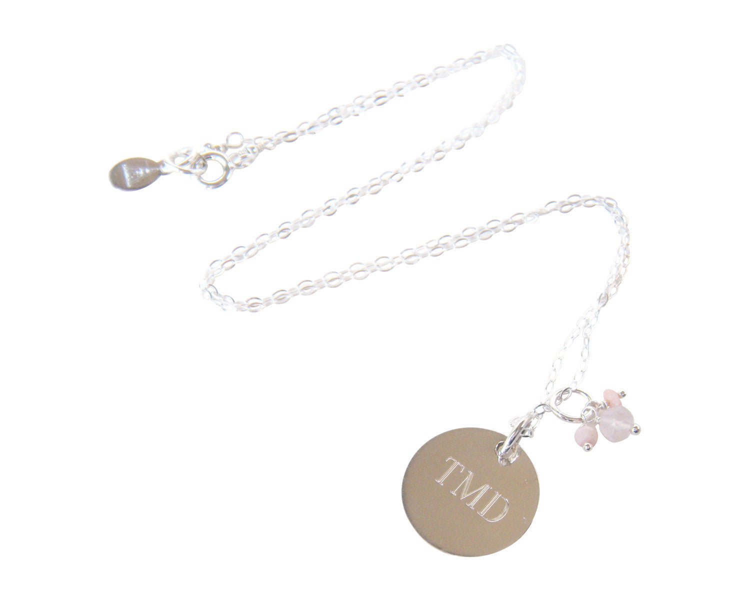 A genuine sterling silver disc with the word 'yes' engraved into the front dangles from a delicate sterling silver chain. Beautiful tiny rose quartz and Peruvian pink opal beads dangle from the chain next to the disc. The chain is finished with a sterling silver spring clasp and a sterling silver tag with the Eos & Alchemy logo.